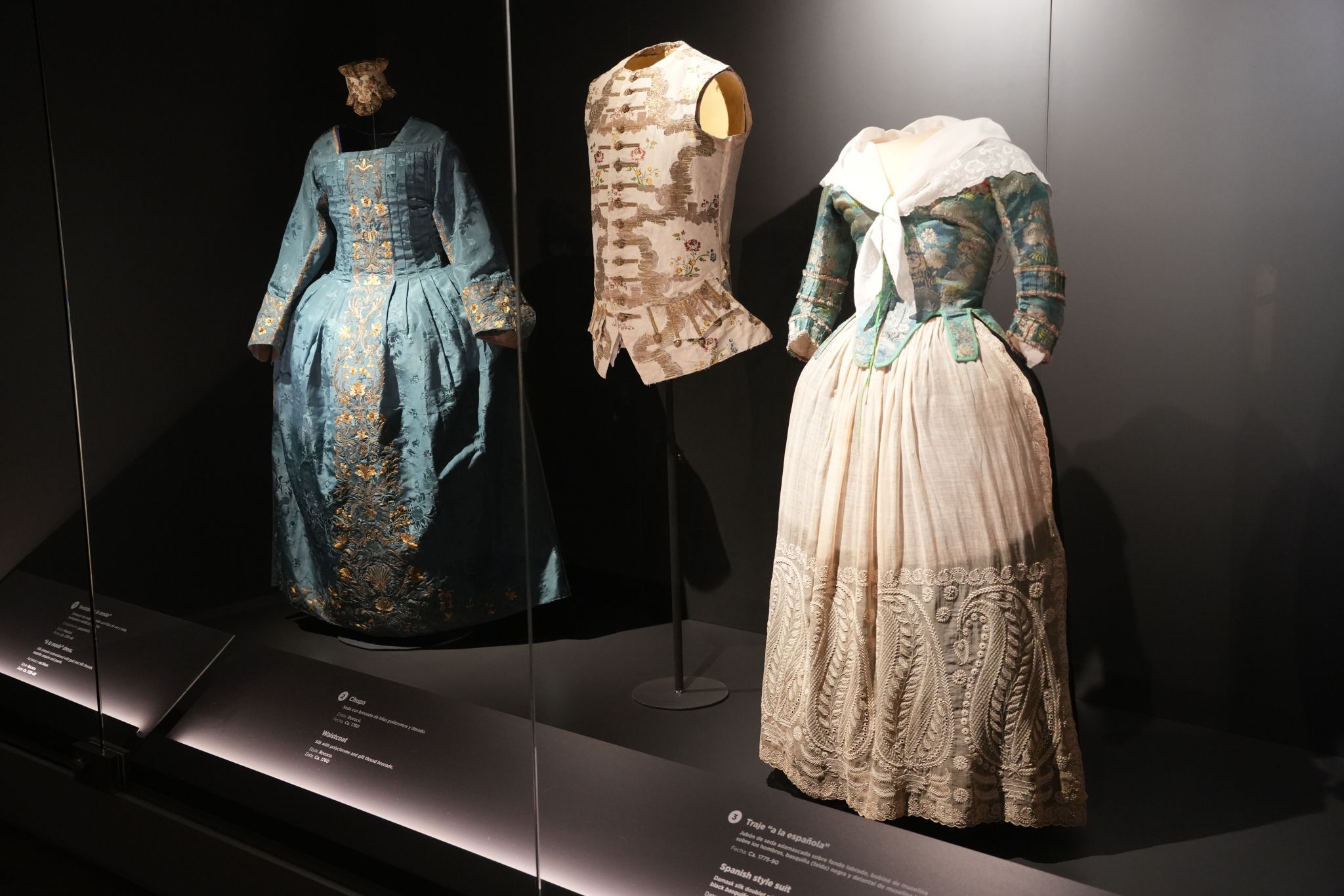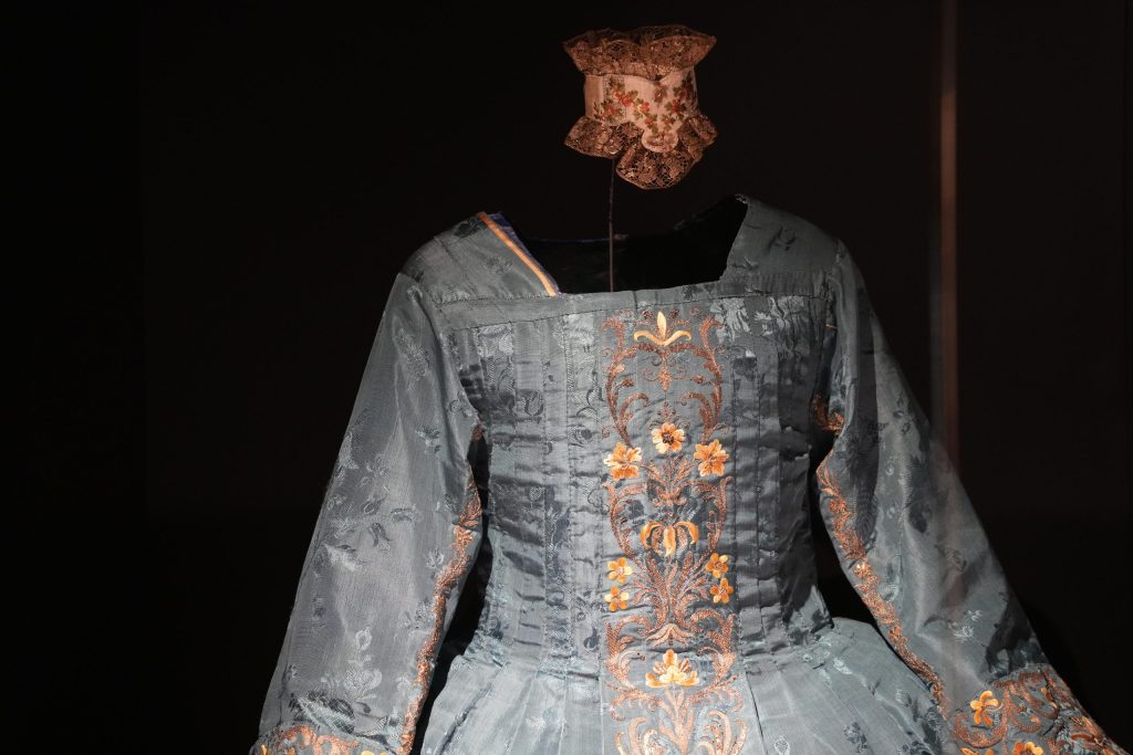 Se trata de un vestido de una sola pieza de mitad del siglo XVIII, al estilo Rococó, con una gran profusión de bordados en oro, algo muy típico de esta moda.