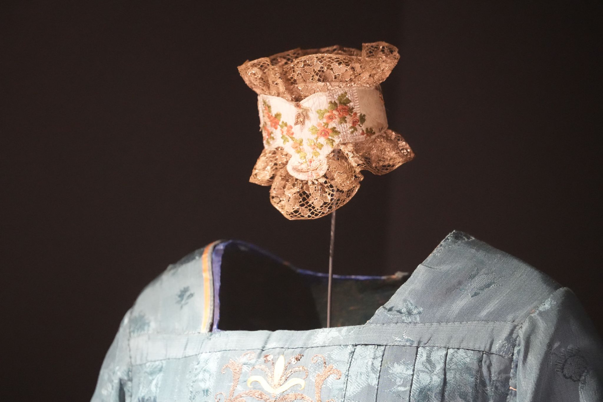Un vestido de damasco en seda, bordado con hilos de oro y seda, con lentejuelas metálicas y perlas, es el modelo del mes de noviembre en el centro museístico Charo Acero. Un vestido que tiene como complemento una gargantilla de seda y chantilly con bordados de flores.