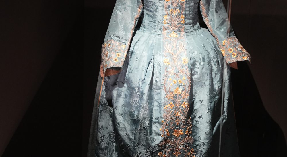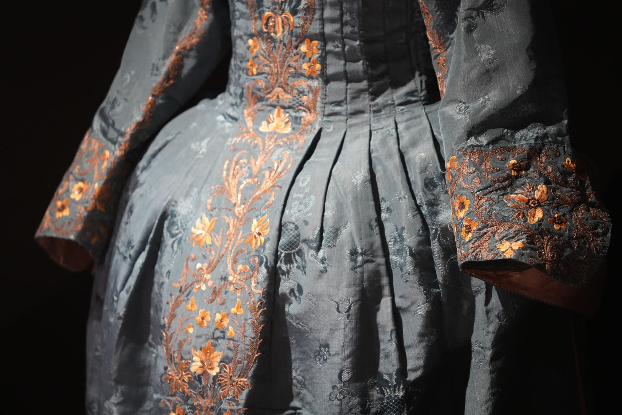 Se trata de un vestido de una sola pieza de mitad del siglo XVIII, al estilo Rococó, con una gran profusión de bordados en oro, algo muy típico de esta moda.