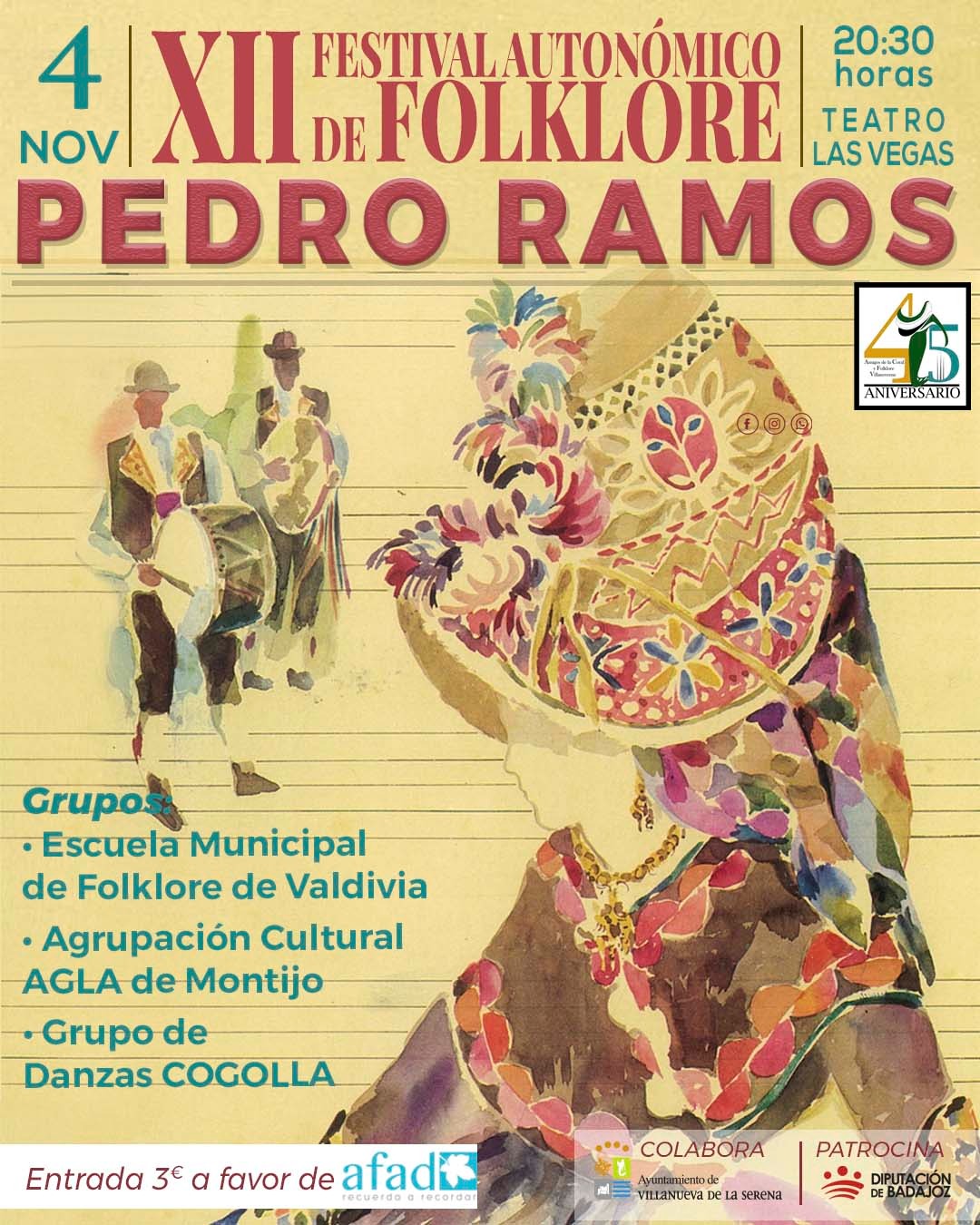 El Festival Autonómico de Folklore “Pedro Ramos” celebrará el próximo 4 de noviembre su décima segunda edición en el teatro Las Vegas a partir de las 20:30 horas. Una edición que vuelve a tener carácter solidario, siendo en esta ocasión, la recaudación para la Asociación Afad Recuerda Extremadura.