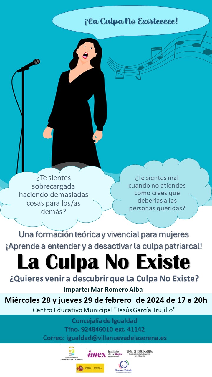 Bajo el lema “La culpa no existe” el próximo miércoles 28 de febrero y jueves día 29, el centro educativo municipal Jesús García Trujillo acogerá una formación teórica y práctica dirigida a mujeres.