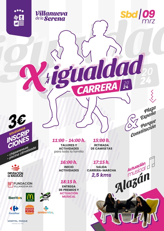 Para finalizar las actividades, el día 9 se celebrará la Carrera por la Igualdad con actividades y talleres desde las once de la mañana y hasta las 19 horas. La salida será a las 17:15 horas y como novedad, habrá seis pruebas al final del recorrido que “de manera divertida y adaptada a todos los públicos, mostrarán las dificultades que tienen las mujeres en su carrera profesional, así como la falta de tiempo libre, la atención a los hijos e hijas, así como a familiares dependientes y el techo de cristal. La jornada finalizará con la actuación de grupo Alazán.