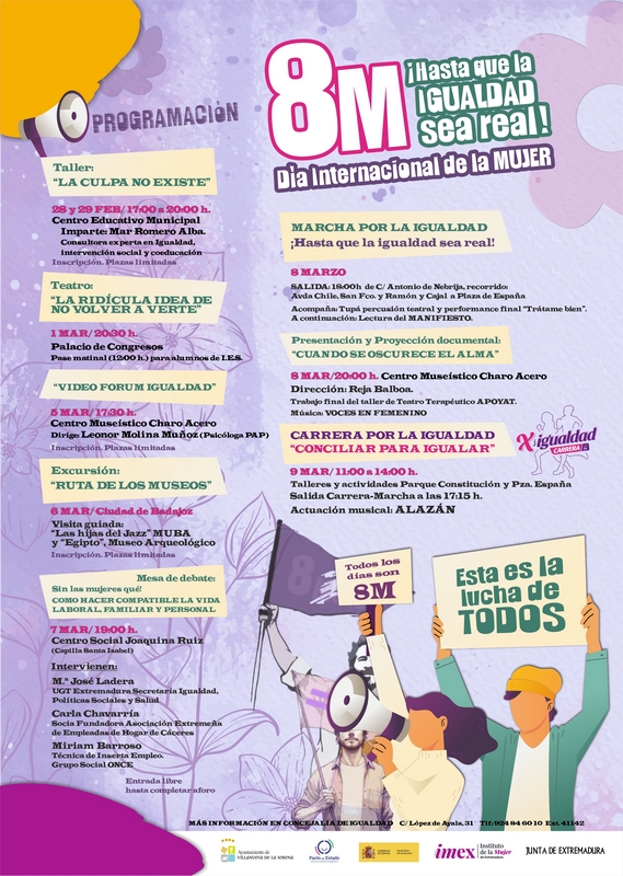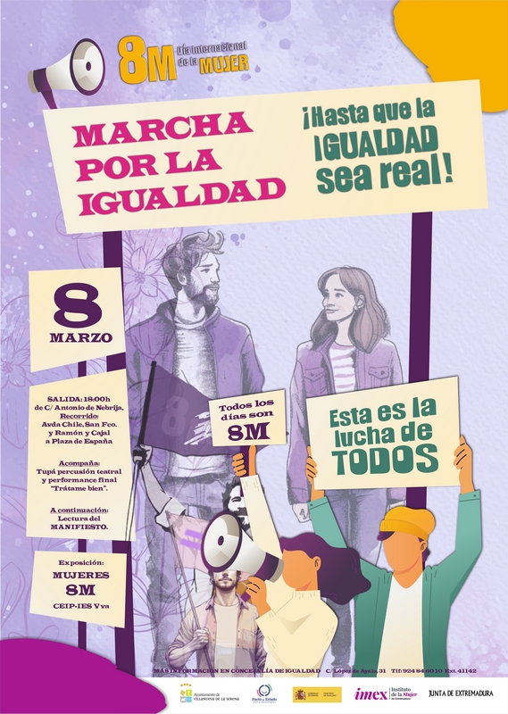 La actividad principal será el día 8, tal como explica Ángela Atanasio, concejala de Igualdad, ya que es cuando se lleva a cabo la marcha por la igualdad bajo el lema ¡Hasta que la igualdad sea real! La marcha será a las 18:00 horas y saldrá desde la calle Antonio de Nebrija y se dirigirá por la avenida de Chile, avenida de San Francisco, calle Ramón y Cajal hasta finalizar en la plaza de España, a continuación, se procederá a la lectura de un manifiesto.