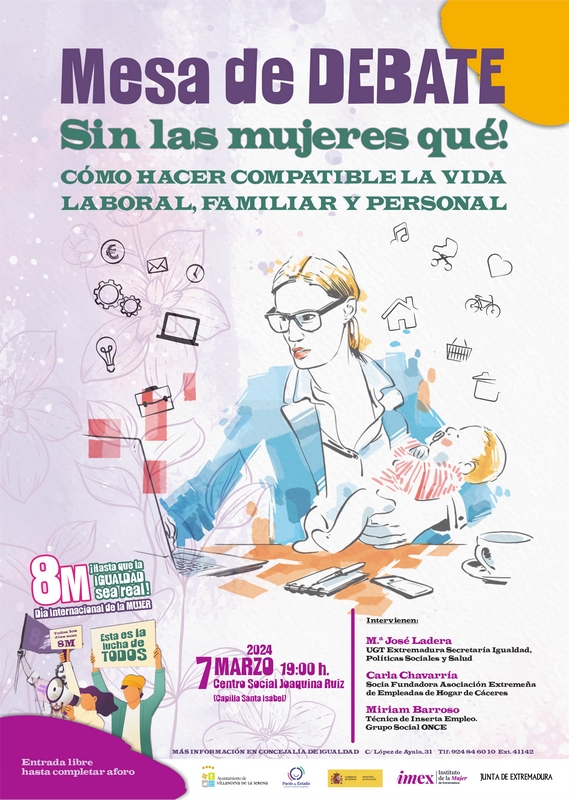 Una mesa debate sobre cómo hacer compatible la vida laboral, familiar y personal, es la siguiente actividad que se desarrollará el 7 de marzo a las 19:00 horas en el Centro Social Joaquina Ruiz. La entrada será gratuita hasta completar aforo. Una mesa debate donde intervendrán Mª José Ladera, de UGT Extremadura, Carla Chavarría socia fundadora de la Asociación Extremeña de Empleadas de Hogar de Cáceres y Miriam Barroso, técnica de Inserta Empleo del grupo social ONCE.