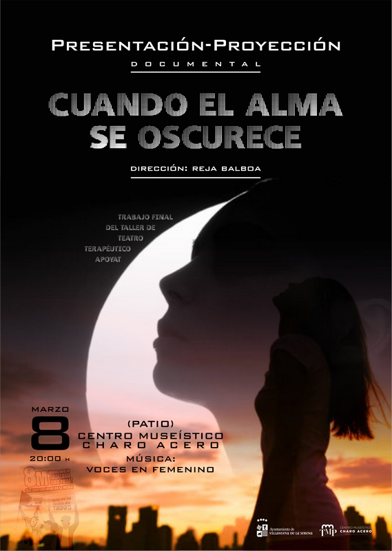 Desde el taller de teatro terapéutico de la asociación APOYAT, el 8 de marzo a las 20:00 horas se proyectará el documental “Cuando se oscurece el alma”. Será en el Centro Museístico Charo Acero y habrá voces en femenino.