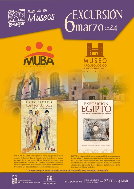 Por otra parte, el día 6 de marzo se llevará a cabo una excursión a Badajoz donde se hará una ruta por los museos. Una visita guiada donde se visitará “Las hijas del Jazz” en el Museo de Bellas Artes de Badajoz y “Egipto” en el museo arqueológico. Las plazas son limitadas por lo que se necesitará inscripción previa. Aquellos interesados, deberán dirigirse al Centro Museístico Charo Acero y se podrán inscribir hasta el 4 de marzo.