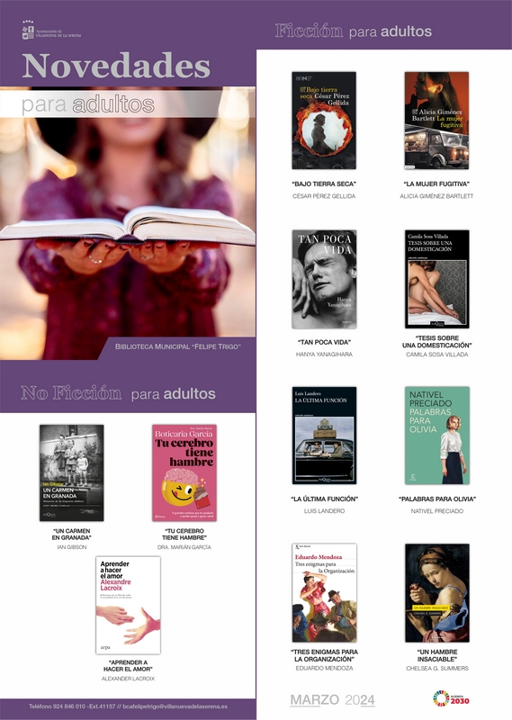 Con respecto a las novedades para adultos, se podrán encontrar “Un Carmen en Granada” de IAN Gibson, “Tu cerebro tiene hambre” de la Doctora Marián García, “Aprender a hacer el amor” de Alexander Lacroix, “Bajo tierra seca” de César Pérez, “La mujer fugitiva” de Alicia Giménez, “Tan poca vida” de Hanya Yanagihara, “Tesis sobre una domesticación” de Camila Sosa, “La última función” Luis Landero, “Palabras para Olivia” de Nativel Preciado, “Tres enigmasa para la organización” de Eduardo Medoza y “Un hambre insaciable” Chelsea G.Summers.