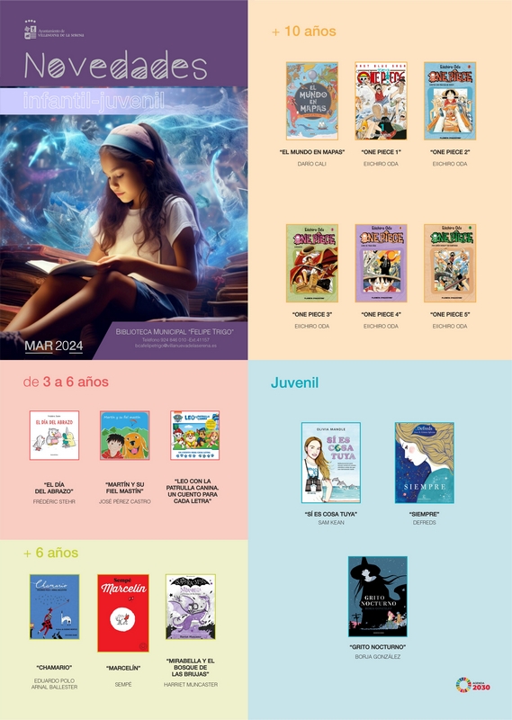 Por último, las novedades para el público infantil son diversas. Entre ellas se encuentran, “El día del abrazo” de Frédéric Stehr, “Martín y su fiel mastín” de José Pérez, “Leo con la patrulla canina. Un cuento para cada letra”, “Chamario” de Eduardo Polo y Arnal Ballester, “Marcelín” Sempé, “Mirabella y el bosque de las brujas” de Harriet Muncaster, “El mundo en mapas” de Arío Cali, “One piece 1, 2, 3, 4 y 5” de Ellchiro Oda, “Si es cosa tuya” de Sam Kean, “Siempre” de Defreds y “Grito nocturno” de Borja González.