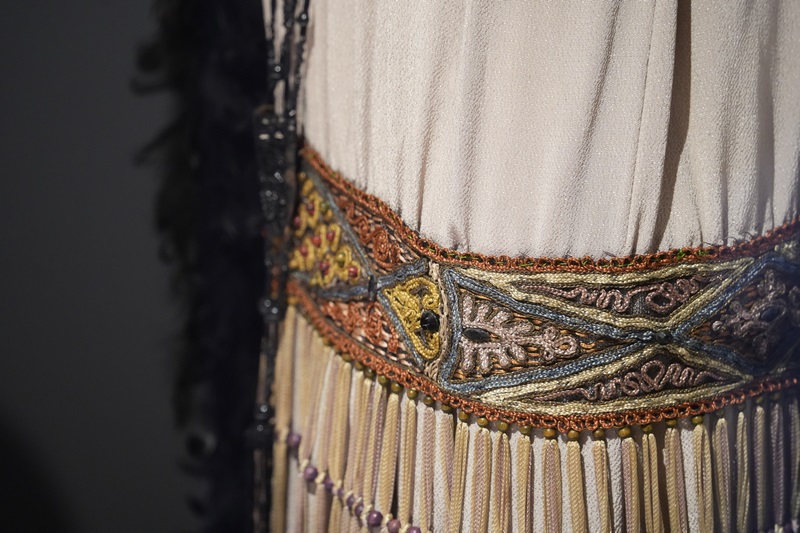 Un vestido de los años 20, es el traje del mes de marzo en el Centro Museístico Charo Acero. Se trata de un vestido de tirantes anchos, de crespón en color taupé con adornos de tiras bordadas y flecos cuyos complementos son unas medias de seda, zapatos plateados, bolso de malla plateada, tocado de seda y tul con bordados de hilo de plata y pedrería negra con pluma, boa negra de plumas en color negro, pipa de plata y cerámica de fumar.