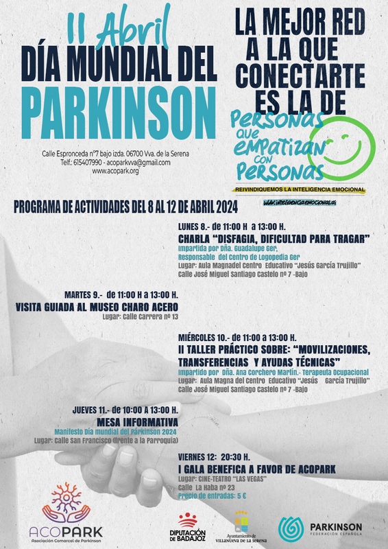 Desde hace cinco años la asociación Acopark, que tiene carácter comarcal y con sede en Villanueva de la Serena, trabaja para hacer visible la enfermedad, concienciar a la sociedad, sensibilizar y ayudar a detectar los síntomas de forma temprana. Desde su creación, la asociación trabaja con el principal objetivo de ofrecer la mejor calidad de vida para las personas afectadas por la enfermedad y sus familiares, dando especial importancia al cuidador principal.