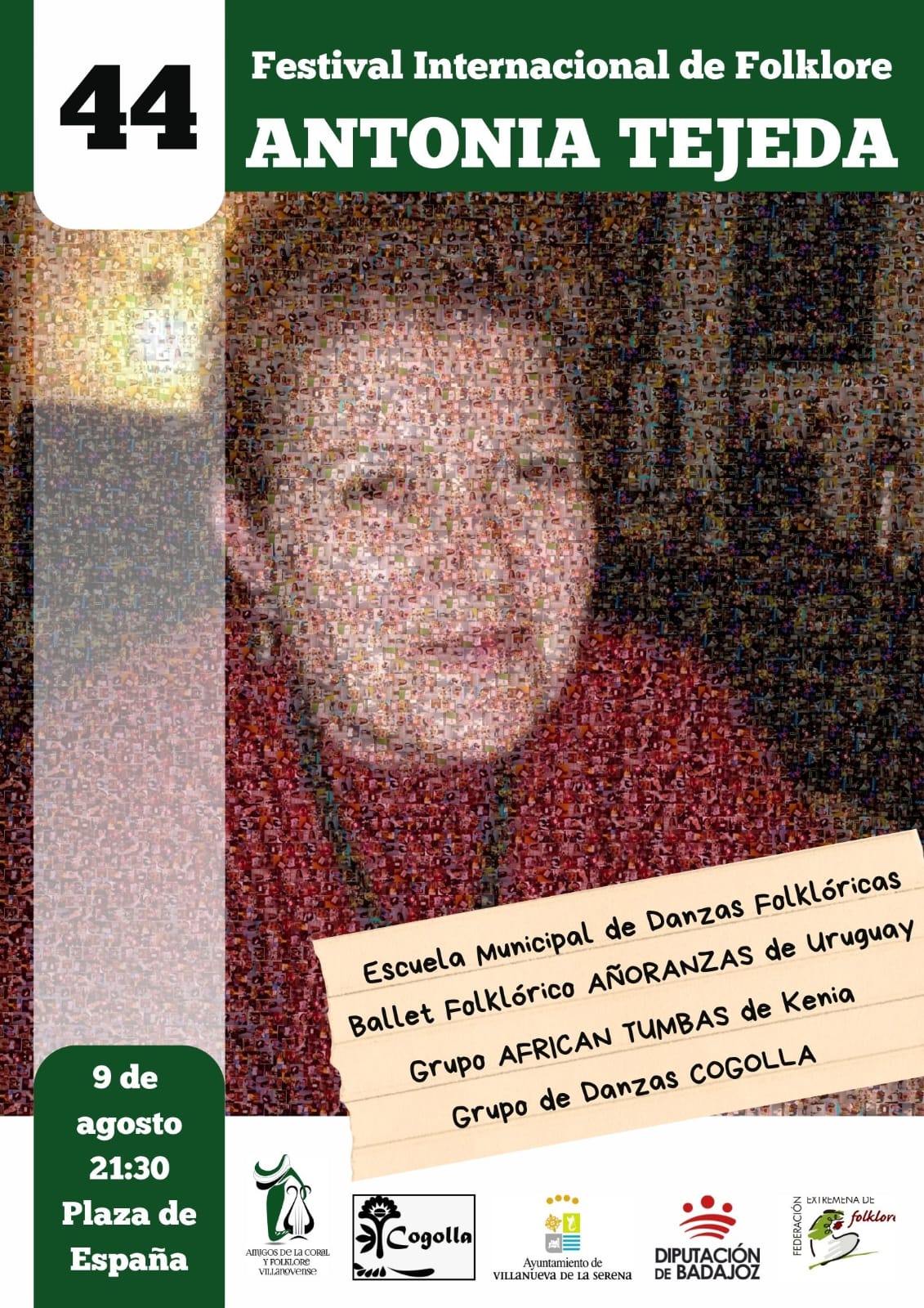 El Festival Internacional de Folklore “Antonia Tejeda” se celebrará este viernes 9 de agosto. Un festival que alcanza su 44 edición y que se celebrará un año más, en la plaza de España. Será a partir de las 21:30 horas, tal como explica Ana Mansanet, concejala de Cultura, y contará con la participación del grupo “African Tumbas” de Kenia, del ballet folklórico “Añoranzas” de Uruguay además de la Escuela Municipal de Danzas Folklóricas de Villanueva de la Serena y Cogolla. Cada grupo interpretará distintos estilos, todo ello enmarcado dentro de un repertorio de canciones y bailes populares de cada zona, ante la mirada de los espectadores que podrán disfrutar de la tradición.