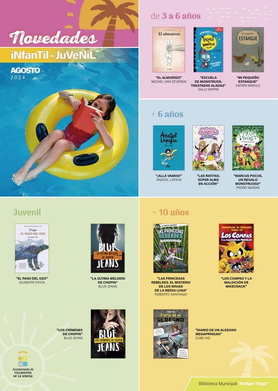 Para el público infantil y juvenil se pueden encontrar “El paso del oso” de Giuseppe Festa, “La última melodía de Chopin” de Blue Jeans, “Los crímenes de Chopin” también de Blue Jeans. A estos títulos se suman “El almuerzo” de Michel Van Zeveren, “Escuela de monstruos. Trastadas Aladas” de Sally Rippin, “Mi pequeño estanque” de Katrin Wiehle, “¡Allá vamos!” de Anatol Lapifia, “Las ratitas. Super alma en acción”, “Marcus pocus. Un regalo monstruoso” de Pedro Mañas, “Las princesas rebeldes. El misterio de los ninjas de la media luna” de Roberto Santiago, “Los compás y la maldición de Mikecrack” y “Diario de un aldeano megapringao” de Cube Kid.
