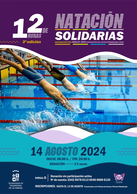El próximo 14 de agosto se celebrará la tercera edición de “12 horas de natación solidarias” en la piscina de verano. Se trata de una prueba no competitiva de carácter solidario que tiene entre sus objetivos promocionar el deporte y hábitos de vida saludables, así como la participación de los clubes y asociaciones deportivas que tienen la natación como modalidad al tiempo que permitirá recaudar fondos, en esta ocasión, destinados a la Asociación de Lupus de Extremadura, ADELEX.