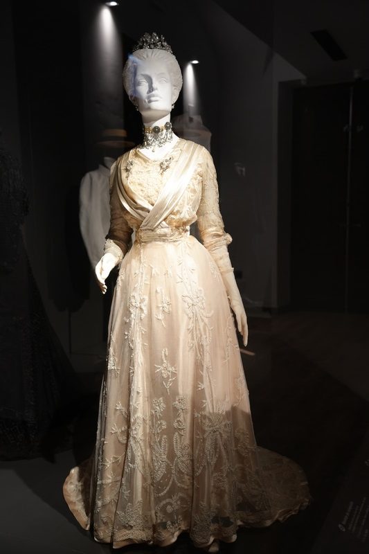 Se trata de un vestido de una sola pieza de tul y encaje de Bruselas con aplicaciones de seda. Como complementos tiene unos guantes, una tiara y alfileres de plata, una gargantilla y pendientes