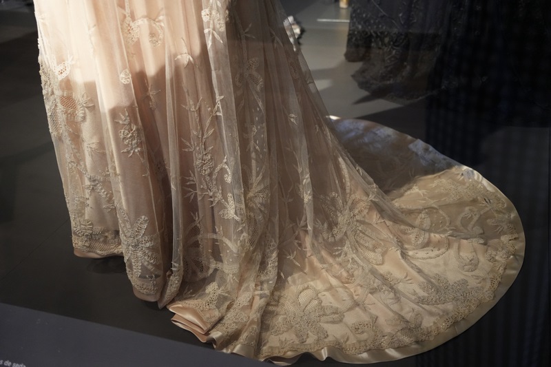 Este vestido es de una sola pieza de tul y encaje de Bruselas con aplicaciones de seda que tiene como complementos, unos guantes, una tiara, alfileres de plata, una gargantilla y pendientes.