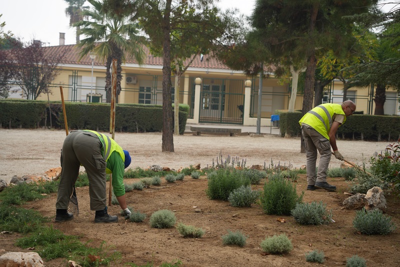 La plaza Rafael Alberti cuenta con una nueva imagen. Se trata de la construcción de una rocalla con rocas volcánicas en la que se han plantado diferentes especies de arbustos y plantas herbáceas con tonalidades de distinto color. En concreto, la parte central está compuesta por Olivilla, Photinia y durillo a las que se suman plantas aromáticas como santolina, romero, rastrero y lavanda. Además, se ha instalado riego localizado automático para todas las plantas con el objetivo de mejorar la eficiencia en el uso del agua.