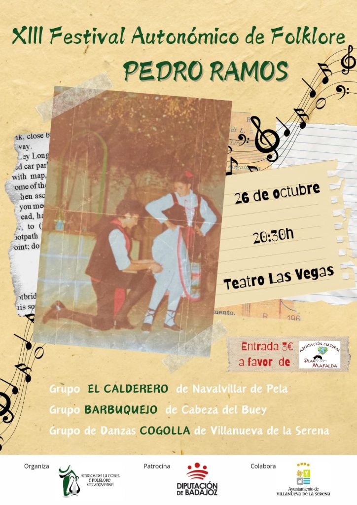 El próximo 26 de octubre se llevará a cabo la décimo tercera edición del Festival Autonómico de Folklore “Pedro Ramos” a las 20:30 horas. Uno de los festivales más importantes, señala Ana Mansanet, concejala de Cultura, que organiza la Asociación de Amigos de la Coral y el Folklore Villanovense en otoño. Un festival que vuelve a tener carácter solidario, siendo la recaudación para la Asociación Cultural Plan Mafalda.