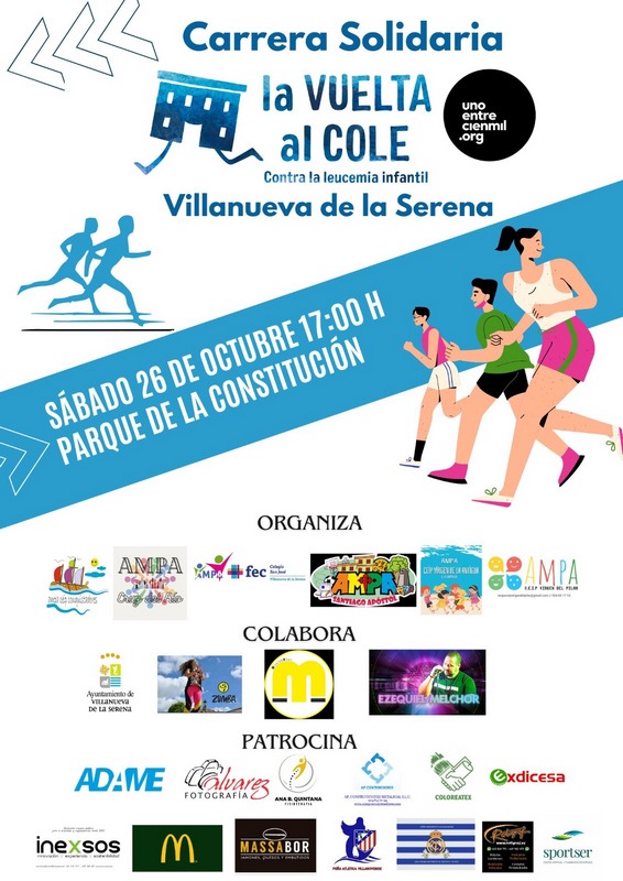 Las AMPAS de Villanueva de la Serena se unen el próximo sábado 26 de octubre para luchar contra la leucemia infantil. Se trata, tal como afirma la concejala de Deportes, María Lozano, de una marcha solidaria en beneficio de los afectados por la leucemia infantil y que se encuentra enmarcado dentro de la décima edición del proyecto “La vuelta al cole unoentrecienmil”.