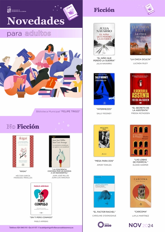 Como cada mes, se incorporan nuevos títulos tanto para el público infantil y juvenil como para los adultos para estos, podrán encontrar “Ikigai” de Héctor García y Francesc Miralles, “La conciencia contada por un sapiens a un neandertal” de Juan José Millás y Juan Luis Arsuaga, “Sin ti pero conmigo” de Pablo Arribas, “El niño que perdió la guerra” de Julia Navarro, “La chica oculta” de Lucinda Riley, “Intermezzo” de Sally Rooney, “El secreto de la asistenta” de Freida Mcfadden, “Mesa para dos” de Amor Towles, “Las lobas de Pompeya” de Elodie Harper, “El factor Rachel “ de Caroline O´Donogue y “Carcoma” de Layla Martínez.