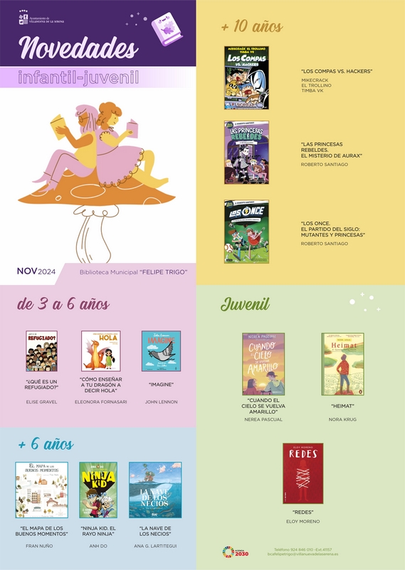 Para el público infantil y juvenil “¿Qué es un refugiado?” de Elise Gravel, “Cómo enseñar a tu dragón a decir Hola” de Eleonora Fornasari, “Imagine” John Lennon, “El mapa de los buenos momentos” de Fran Nuño, “Ninja Kid. El Rayo Ninja” de Anh Do, “La nave de los necios” de Ana G. Lartitegui, “Los compas Vs. Hackers” de Mikecrack, el trollino y Timba Vk, “Las princesas rebeldes. El misterio de Aurax” de Roberto Santiago, “Los once. El partido del siglo: mutantes y princesas” de Roberto Santiago, “Cuando el cielo se vuelva amarillo” de Nerea Pascual, “Heimat” de Nora Krug y “Redes” de Eloy Moreno.