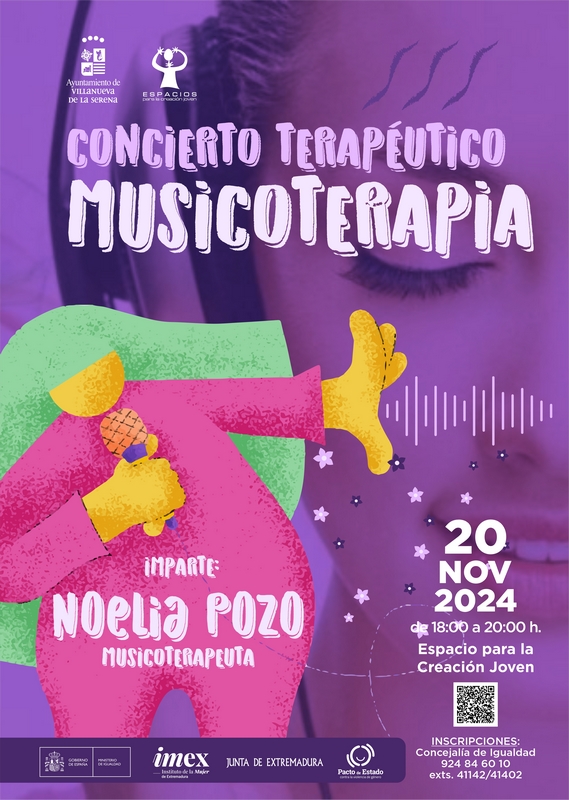 A estas actividades se suma un concierto terapéutico que se llevará a cabo el 20 de noviembre desde las 18:00 horas hasta las 20:00 horas en el Espacio para la Creación Joven. Se trata de un taller donde se utilizarán distintas técnicas musicoterapéuticas como la improvisación, el songwriting, audiciones activas y otras dinámicas con el objetivo de mejorar la salud emocional y físico. Para aquellas mujeres interesadas, deberán inscribirse previamente llamando al teléfono 924 84 60 10 extensión 41142 o capturando el código QR del cartel.