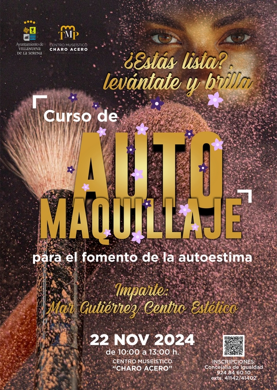 La última de las actividades, se llevará a cabo en el Centro Museístico Charo Acero el día 22 de noviembre en horario de 10:00 horas hasta las 13:00 horas. Se trata de un curso de automaquillaje ya que maquillarse puede ser una herramienta para aumentar la autoestima y sentirse más segura.