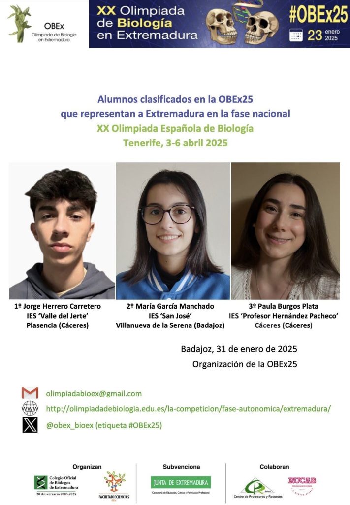 María García Manchado representará a Extremadura en la Olimpiada Nacional de Biología que se celebrará en la Universidad de La Laguna en Tenerife junto a Jorge Herrero de Plasencia y Paula Burgos de Cáceres