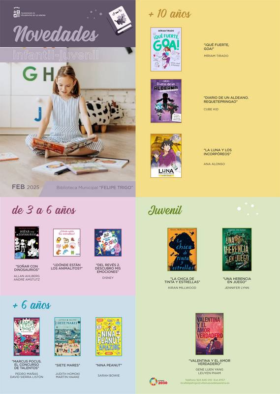Por último, este mes de febrero también cuenta con novedades para el público infantil y juvenil entre ellos títulos como “Soñar con dinosaurios” de Allan Ahlberg y André Amstutz, “Dónde están los animalitos”, “Del revés 2. Descubro mis emociones” de Disney, “Marcus Pocus. El concurso de talentos” de Pedro Mañas y David Sierra Listón, “Siete mares” de Judith Homoki y Martín Haake, “Niña Peanut” de Sarah Bowie, “Qué fuerte, Goa de Miriam Tirado, “Diario de un aldeano. Requetepringao” de Cube Kid, “La luna y los incorpóreos” de Ana Alonso, “La chica de tinta y estrellas” de Kiran Millwood, “Una herencia en juego” de Jennifer Lynn y “Valentina y el amor verdadero” de Gene Luen y Leuyen Pham.