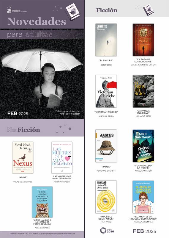 Con respecto a las novedades para los lectores adultos, se podrán encontrar “Nexus” de Yuval Noah Harari, “Las mujeres que aman demasiado” de Robin Norwood, “Cómo mandar a la mierda de forma educada” de Alba Cardalda, “Blancura” de Jon Fosse, “La saga de los longevos” de Eva Sáenz de Urturi, “Victorian psycho” de Virginia Feito, “La pareja del siglo” de Julia Schoch, “James” de Percival Everett, “Cuando llega la noche” de Mikel Santiago, “Imposible decir adiós” de Han Kang y “El amor es un proceso complicado” de Marilena Sommer.