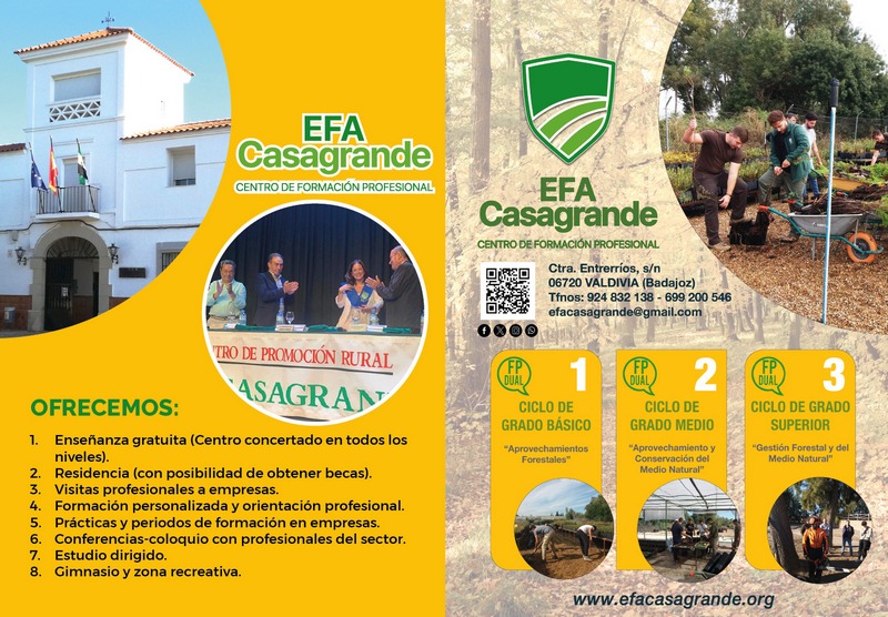 El centro EFA Casagrande oferta diversos ciclos de formación profesional forestal. Se trata de una enseñanza gratuita que ofrece residencia y servicio de comedor con posibilidad de obtener becas, con visitas profesionales a empresas además de prácticas y periodos de formación en empresas que favorecen la inserción laboral, conferencias con profesionales del sector, gimnasio y zona recreativa.