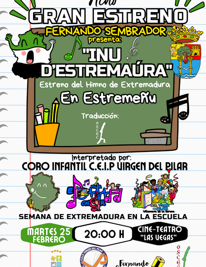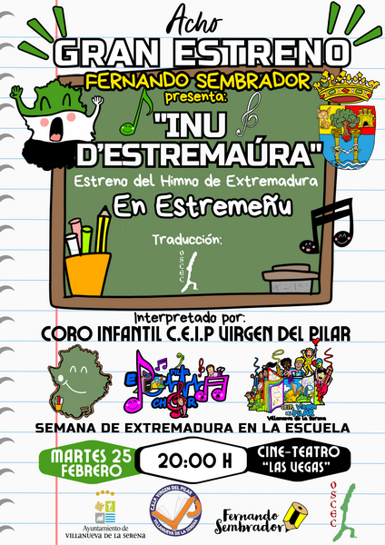 El artista villanovense Fernando Sembrador, presentará este martes 25 de febrero el proyecto “Inu D´Estremaúra”. Se trata de un evento donde por primera vez, se estrenará el himno de Extremadura en Estremeñu, traducido por el Órgano de Seguimiento y Coordinación del Extremeño y su Cultura (OSCEC) e interpretado por el coro infantil del CEIP Virgen del Pilar.