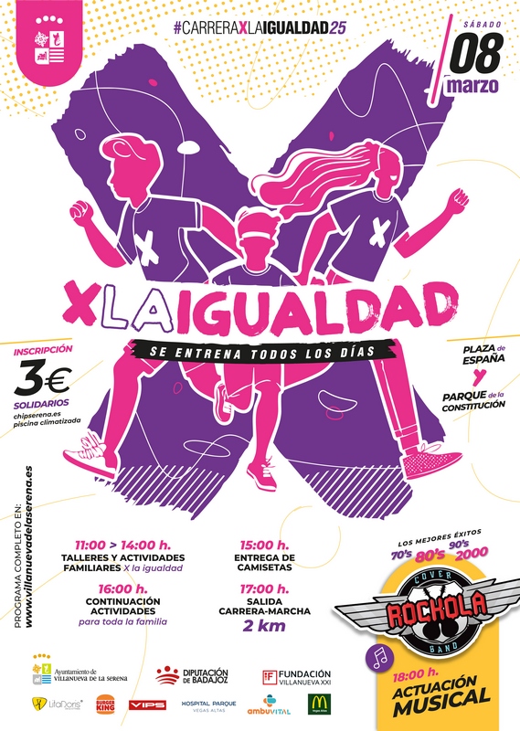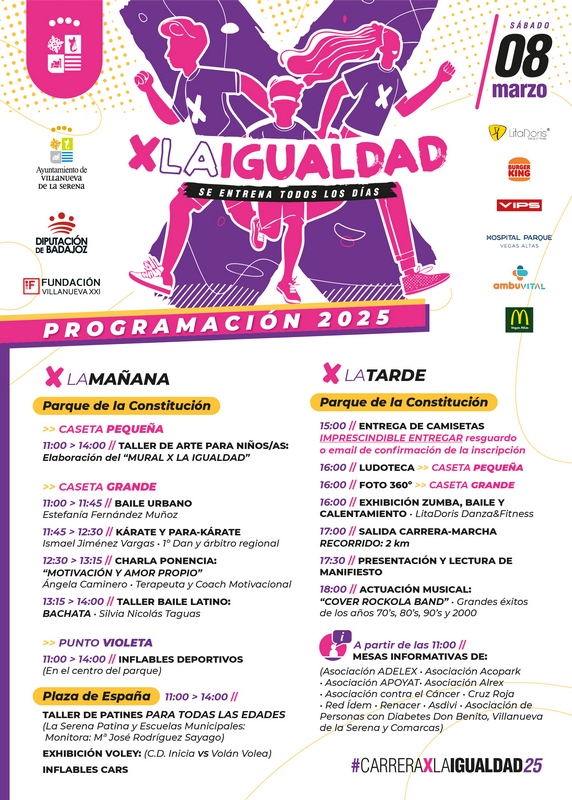 La jornada, destaca María Lozano, concejala de Deportes, explica que comenzará a las 11 de la mañana con diversos talleres y actividades en el parque de la Constitución y en la plaza de España. En concreto se trata de un taller de arte para niños en el que elaborarán un mural por la igualdad, un taller de baile latino, baile urbano, una exhibición de kárate y para kárate, una charla motivacional, así como un punto violeta e hinchables. En la plaza de España habrá un taller de patines para todas las edades, una exhibición de vóley, así como inflables cars. Por la tarde, a partir de las 15 horas se hará entrega de las camisetas y comenzará el precalentamiento con sesiones de zumba y baile mientras que a las 17 horas comenzará la carrera cuyo recorrido es de dos kilómetros. Como el pasado año, los participantes deberán superar varios obstáculos que aparecerán en distintos lugares del recorrido. Al finalizar, habrá un espacio para llenar de mensajes y testimonios para lograr un cambio social vinculado a la igualdad y a la conciliación ya que, añade Lozano, hay que visibilizar el problema actual de la conciliación en la sociedad ya que sigue siendo la mujer a quien se le atribuyen los cuidados a familiares y quienes reducen su jornada laboral para ello.