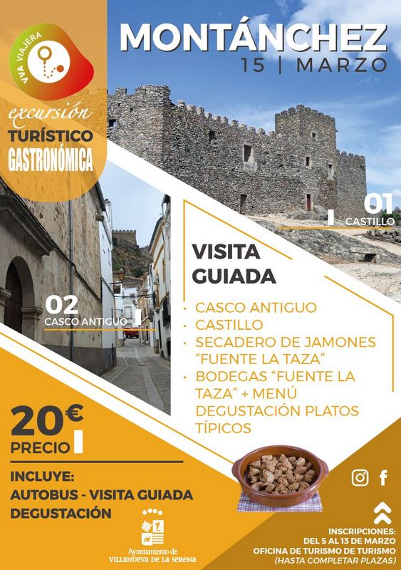 El próximo 15 de marzo se llevará a cabo una excursión turística gastronómica a Montánchez. Se trata de una iniciativa llevada a cabo por la concejalía de Turismo y los participantes, tendrán la oportunidad de disfrutar de una visita guiada por la localidad conociendo el casto antiguo, el castillo, el secadero de jamones “Fuente la Taza” y sus bodegas. A estas actividades se suma un menú degustación con platos típicos de la zona.