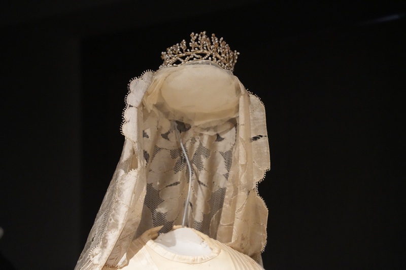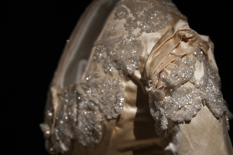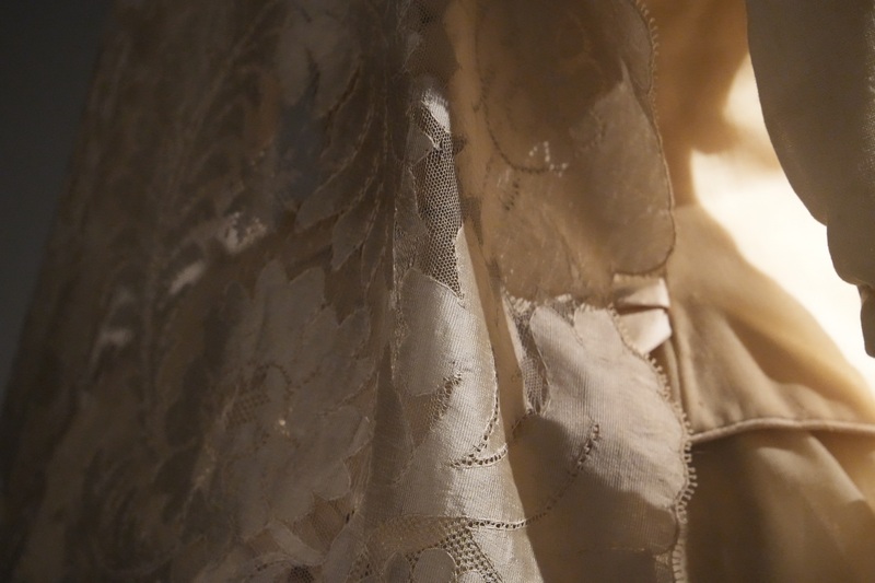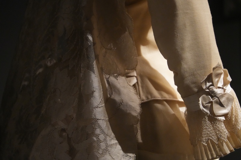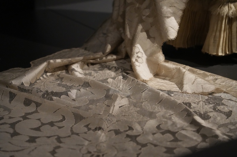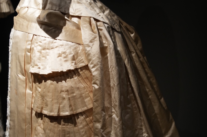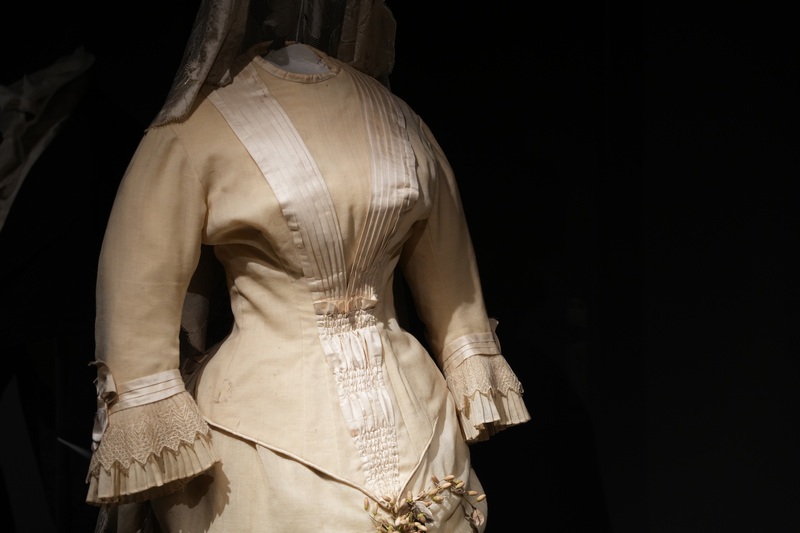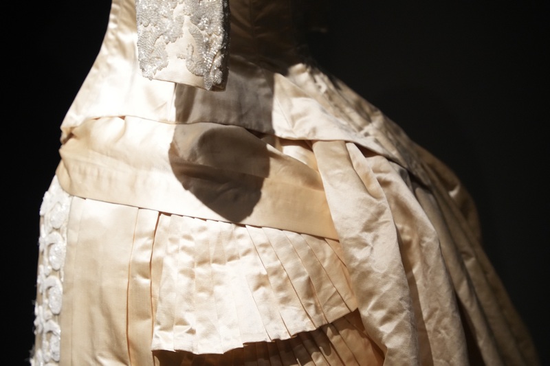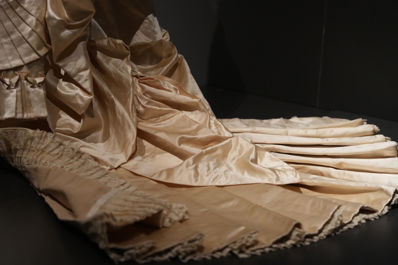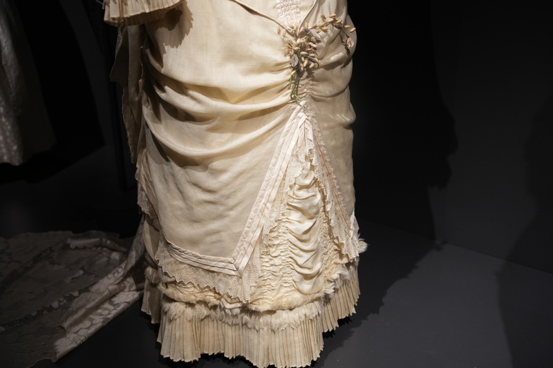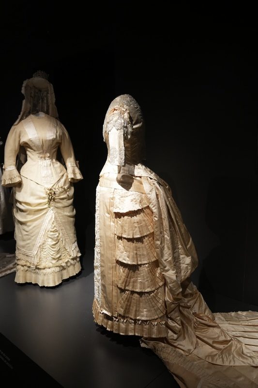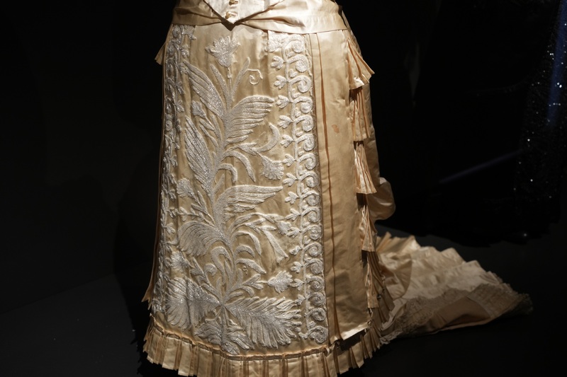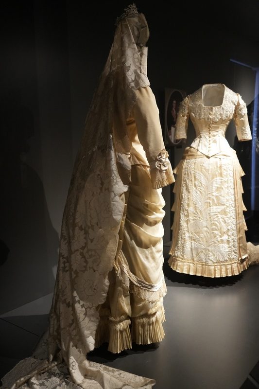 Estos dos vestidos se componen de jubón emballenado con manga tres cuartos y falda, siendo esta última prenda la que resulta más llamativa por sus diseños, drapeados y bordados. Como ocurrió en esta década, estos vestidos se caracterizan por la combinación de tejidos, hilo y seda en el ejemplar de falda sin cola y seda al tiempo que tiene tul bordado con canutillos de cristal en el que presenta cola plisada y forma de abanico. Los tonos de sus tejidos son marfil y beige claro. El modelo de 1881 se complementa con larga mantilla de seda, del mismo periodo y realizada a mano.