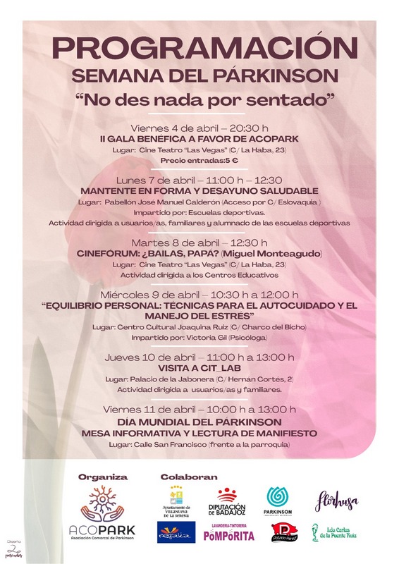 A esta iniciativa se suma una programación destinada a toda la población en general y en especial a las personas que padecen esta enfermedad y sus familias que durará hasta el día 11, Día Mundial del Párkinson. En concreto el lunes día 7, se llevará a cabo en el pabellón José Manuel Calderón un desayuno saludable y una actividad deportiva desde las 11 horas hasta las 12:30 horas, mientras que el día 8, habrá un cinefórum ¿Bailas, papá? en el teatro Las Vegas a las 12:30 horas.