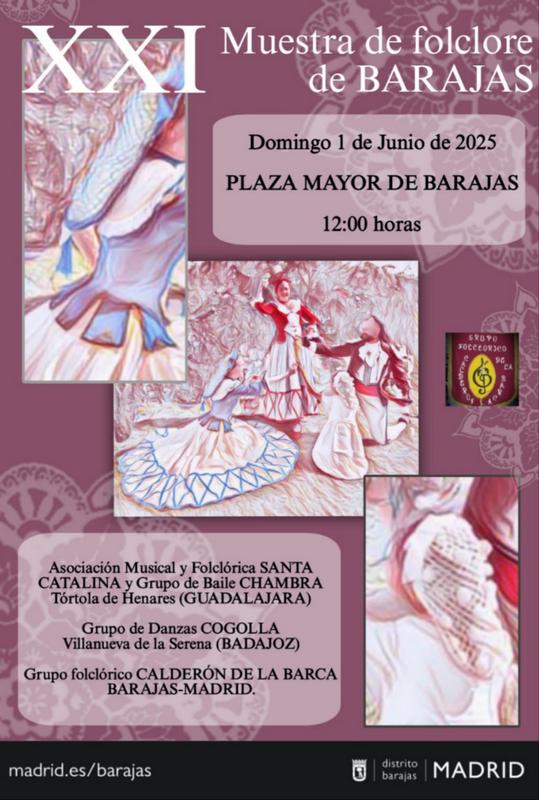 Además, el domingo día 1, también serán partícipes de la XXI Muestra de Folclore de Barajas donde bailarán junto a la Asociación Musical y Folclórica Santa Catalina y grupo de baile Chambra de Tórtola de Henares y el grupo folclórico Calderón de la Barca de Barajas.