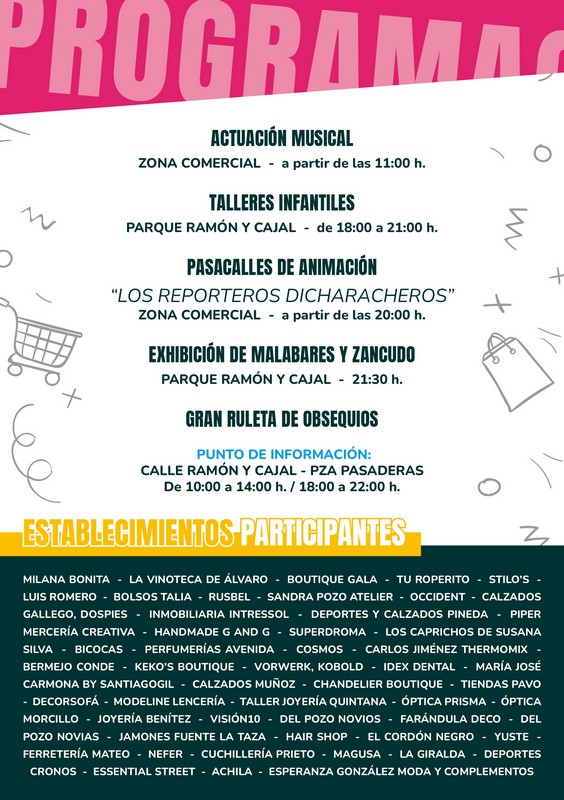 Esta campaña comenzará a las 10 de la mañana hasta las 22 horas y durante todo el día se desarrollarán diversas actividades que se centran en la avenida de San Francisco, plaza de San Bartolomé, plaza de Las Pasaderas y la calle Ramón y Cajal. Entre ellas destaca, una actuación musical, talleres infantiles, pasacalles de animación, exhibición de malabares y zancudo, así como una gran ruleta de obsequios. A ello, se suma una ludoteca y un punto informativo desde las 10 horas hasta las 14 horas y por la tarde desde las 18 horas hasta las 21 horas. Los ciudadanos que a lo largo del día realicen sus compras en las empresas adheridas a la campaña, podrán conseguir regalos presentando su ticket de compra, por valor mínimo de 5€, en el punto informativo que instalará en las inmediaciones de la calle Ramón y Cajal.