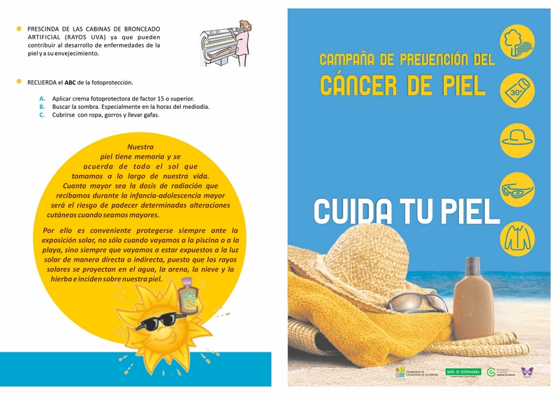 Bajo el lema “Cuida tu piel” la concejalía de Salud Pública a través del programa Ciudades Saludables y Sostenibles, pone en marcha un año más, una nueva campaña de prevención de cáncer de piel que tiene entre sus objetivos, prevenir la aparición de enfermedades en la piel y los ojos; incidiendo en las medidas de prevención, hábitos y uso de protectores solares para disminuir los daños potenciales de la exposición solar, así como concienciar en la importancia de la educación solar.