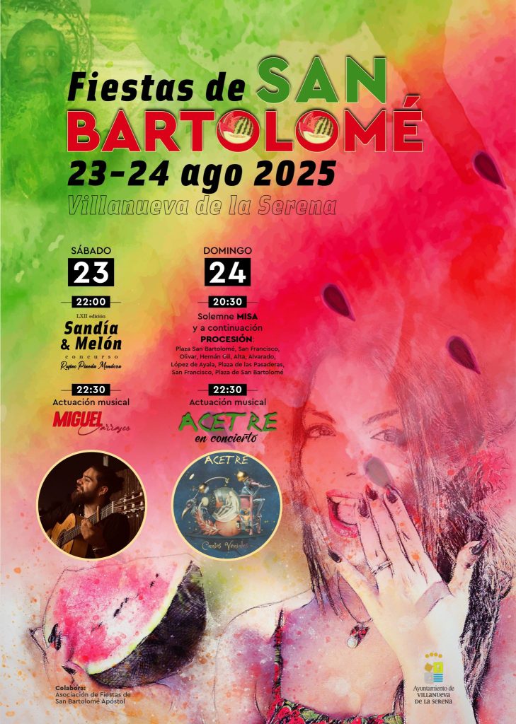 Las fiestas comenzarán el día 23 a las 22:00 horas con el tradicional concurso de sandía y melón Rufino Pineda Mendoza que alcanza su 62 edición. Jesús Ramos, presidente de la Asociación de Fiestas de San Bartolomé Apóstol destaca que la recepción de los frutos será a partir de tres horas antes de que comience el concurso y estará abierto hasta 15 minutos antes. Un concurso que este año, estará amenizado con la actuación musical de Miguel Carrasco que, durante el concurso, interpretará diversas piezas musicales.