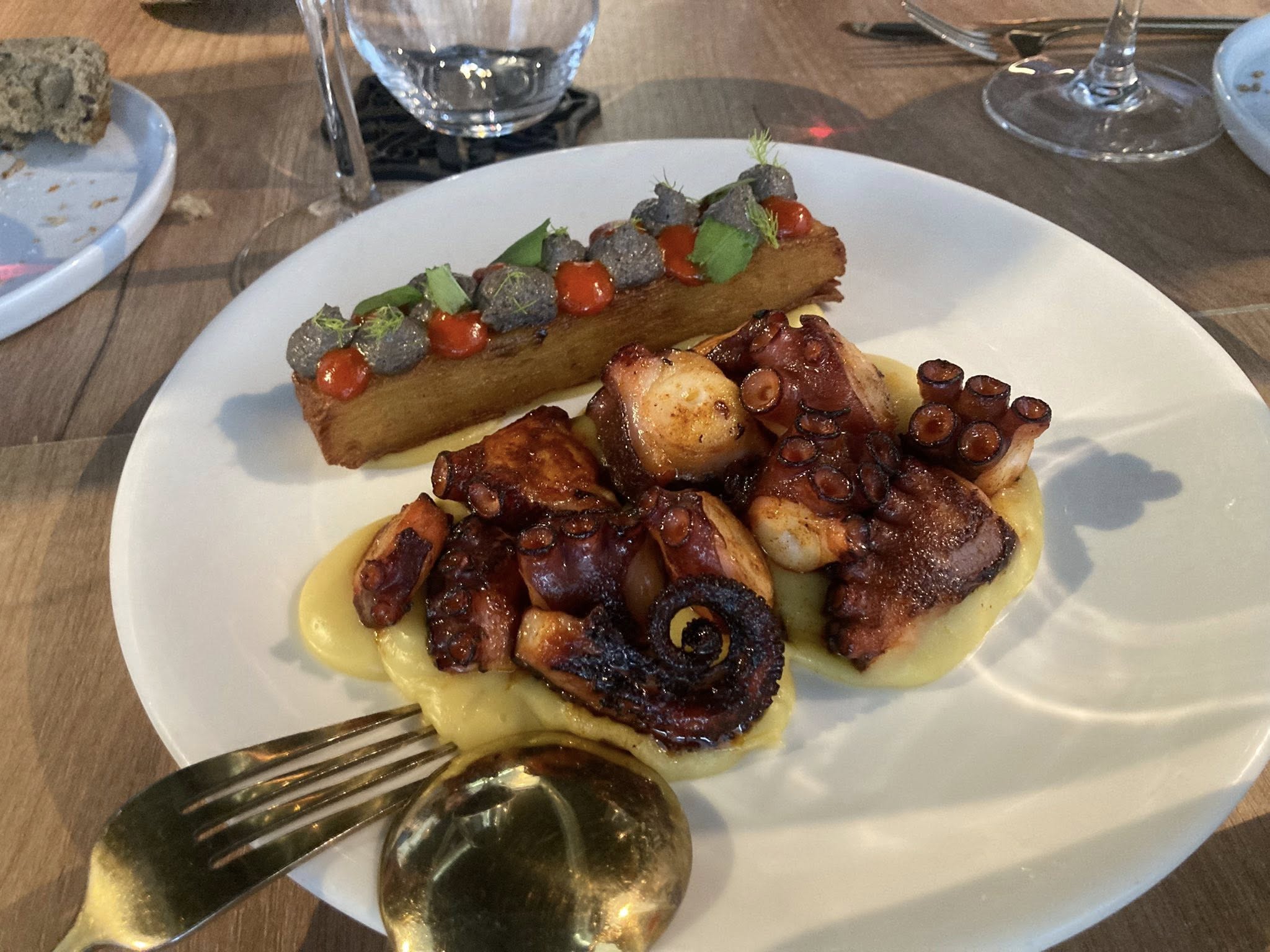 Entre sus platos estrella está la ensaimada planchada extremeña, el cabrito Verato-Retinto deshuesado y su tarta ahumada de queso.