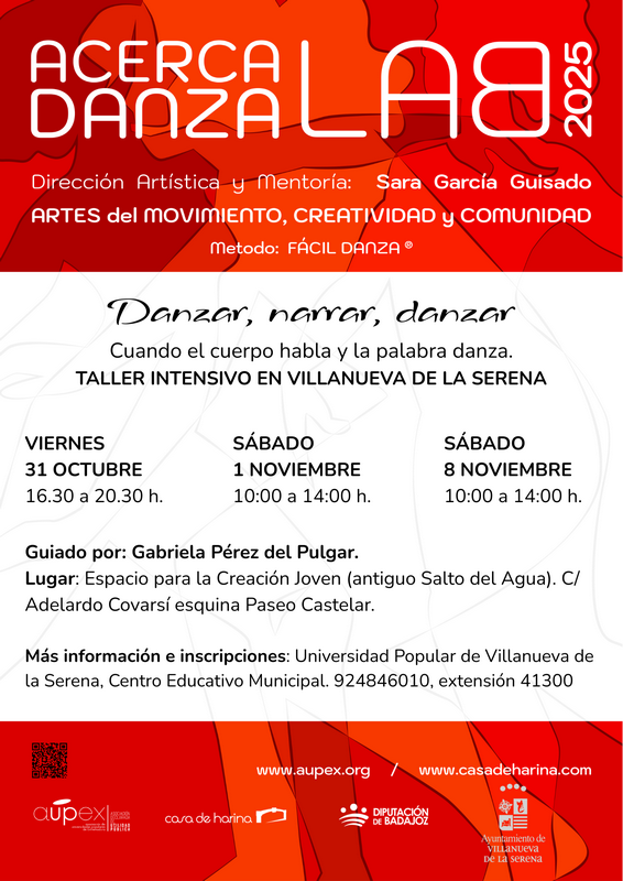 Por otra parte, el próximo 31 de octubre, 1 y 8 de noviembre, se impartirá un taller denominado “Acercadanza” en el Espacio para la Creación Joven. Se trata, explica Atanasio, de un taller destinado a mayores de 16 años que quieran explorar las conexiones entre el leguaje, la danza y la expresión oral impartido por Gabriela Pérez del Pulgar que busca conseguir la reconexión entre el cuerpo y la palabra a través de la danza y el movimiento.