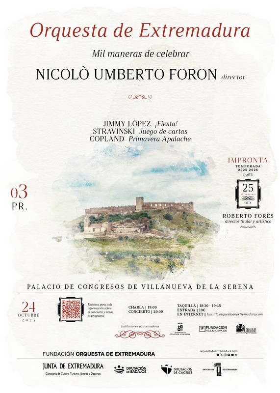 La programación, explica Hae Won Oh, gerente de la Orquesta de Extremadura, empezará el 24 de octubre con el debut como director invitado por la OEX de Nicolò Umberto Foron, actual director asistente de la prestigiosa Orquesta Sinfónica de Londres. Un programa lúdico y festivo, con la obra ¡Fiesta! “Cuatro bailes pop para orquesta”, de Jimmy López, “Juego de cartas”, de Stravinski y “ Primavera Apalache”, de Copland.