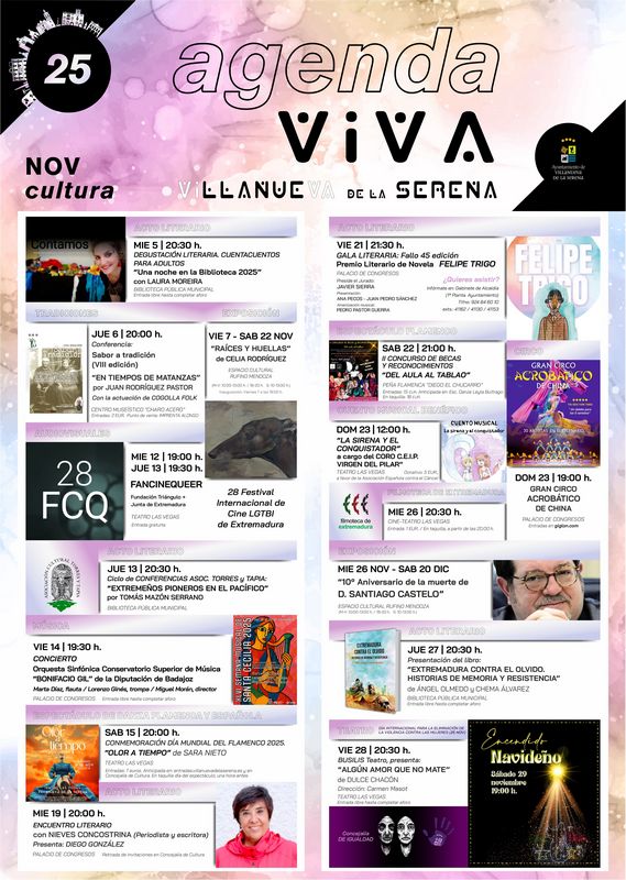 Una programación cultural cargada de propuestas diversas y para todos los públicos para este mes de noviembre en el que el eje central es el fallo del 45º Premio Literario Felipe Trigo, así lo ha explicado la concejala de Cultura Ana Mansanet, quien destaca que se trata de un acontecimiento que vuelve a situar a Villanueva de la Serena en el mapa literario nacional. Una edición que contará con la presencia de Javier Sierra como presidente del jurado y Pedro Pastor como amenizador musical.
