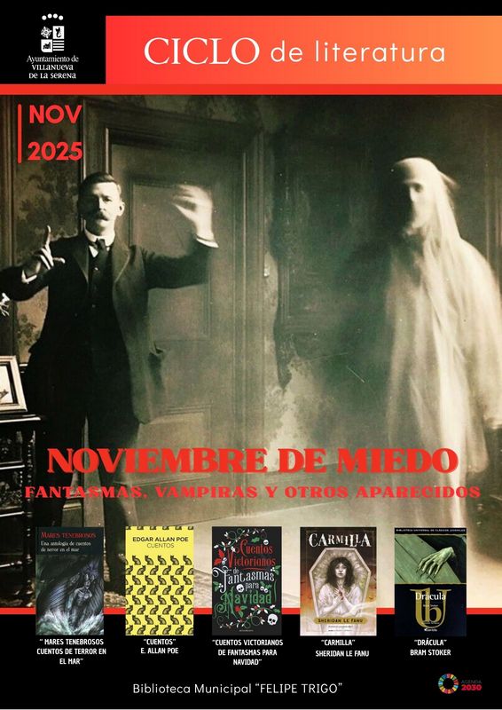 El ciclo de literatura, y teniendo en cuenta que noviembre es el mes de “Todos los santos” y Halloween, se ha dedicado a la literatura de miedo, a libros protagonizados por fantasmas, vampiras y otros aparecidos. En concreto los títulos disponibles son “”Mares tenebrosos, cuentos de terror en el mar”, una antología de relatos de terror ambientados en el  mar; “Cuentos” de Edgar Allan Poe; “Cuentos victorianos de fantasmas para Navidad”, una recopilación de trece relatos escalofriantes de la época victoriana; “Carmilla” de Sheridan Le Fanu, y por supuesto la obra literaria referente en el terror como es “Drácula” de Bram Stoker.