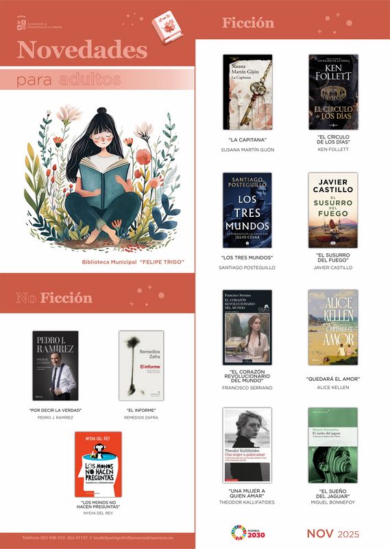 Por lo que respecta a las novedades de adultos, este mes de noviembre  hay un total de 11, tres ellas de no ficción que son “Por decir la verdad” de Pedro J. Ramírez, “El informe de Remedios Zafra, y “Los monos no hacen preguntas” de Nydia del Rey. En cuanto a las novedades de ficción los títulos disponibles son: “Los tres mundos” de Santiago Posterguillo, “El susurro del fuego” de Javier Castillo, “La capitana” de la villanovense Susana Martín Gijón, “El círculo de los días” de Ken Follet, “El corazón revolucionario del mundo” de Francisco Serrano, “Quedará el amor” de Alice Kellen, “El sueño del jaguar” de Miguel Bonnefoy, y “Una mujer a quien amar” de Thedor Kallifatides.