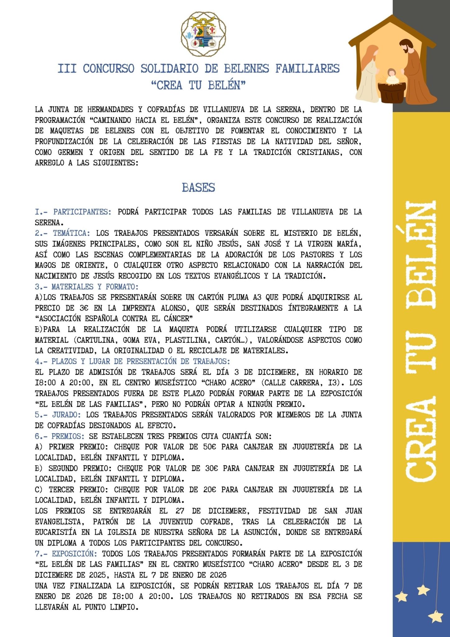 Además, y por tercer año consecutivo, se celebrará el Concurso Solidario de Belenes Familiares denominado “Crea tu Belén” donde podrán participar las familias. Tan solo, deberán adquirir la base para la realización del Belén en la imprenta Alonso por 3 euros. La recaudación en esta ocasión será destinada a la AECC. Una vez que finalicen la entrega de trabajos, se llevará a cabo una exposición en el Centro Museístico Charo Acero del 3 de diciembre al 7 de enero.
