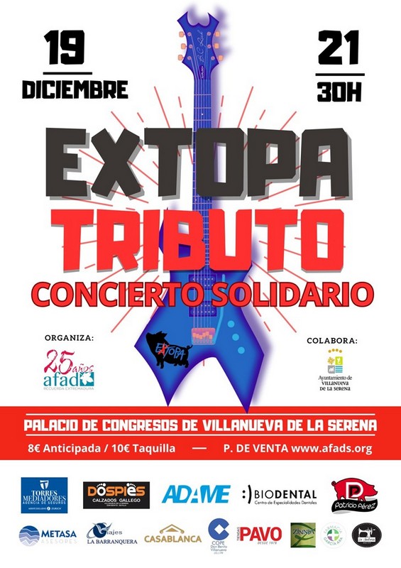 Afad Recuerda Extremadura clausura la celebración de su 25 aniversario con un concierto solidario el 19 de diciembre a las 21:30 horas en el palacio de congresos. El grupo Extopa Tributo será el encargado de poner el toque musical donde los asistentes podrán disfrutar de canciones del mítico grupo Estopa, que repasarán los grandes éxitos de los hermanos Muñoz. El precio de la entrada es de 8 euros anticipada en la concejalía de Cultura, en AFAD o también se puede adquirir en la taquilla el mismo día por 10 euros.