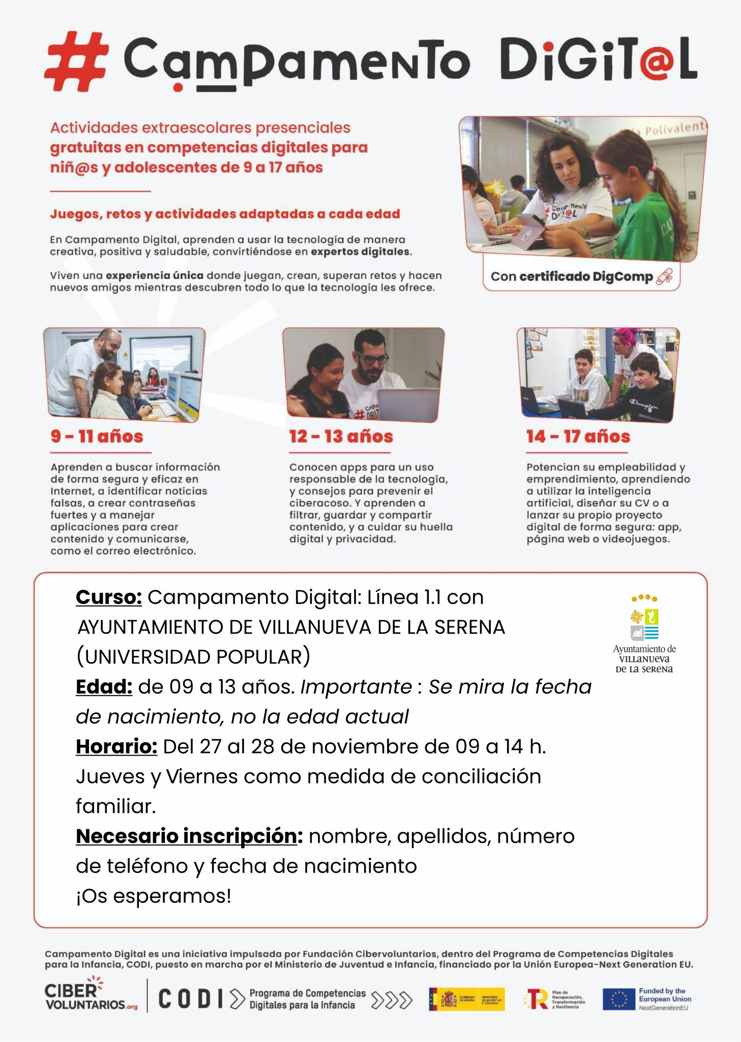 Por otra parte, también se lleva a cabo el campamento digital dirigido a niños de edades comprendidas de 9 a 13 años. Un curso gratuito que se imparte el jueves 27 y viernes 28 de noviembre desde las 9 horas hasta las 14 horas. Las inscripciones serán hasta el 21 de este mes y los interesados podrán hacerlo en el Centro Educativo Municipal Jesús García Trujillo.