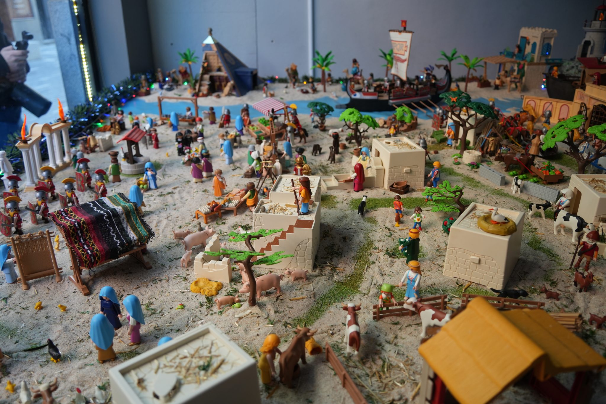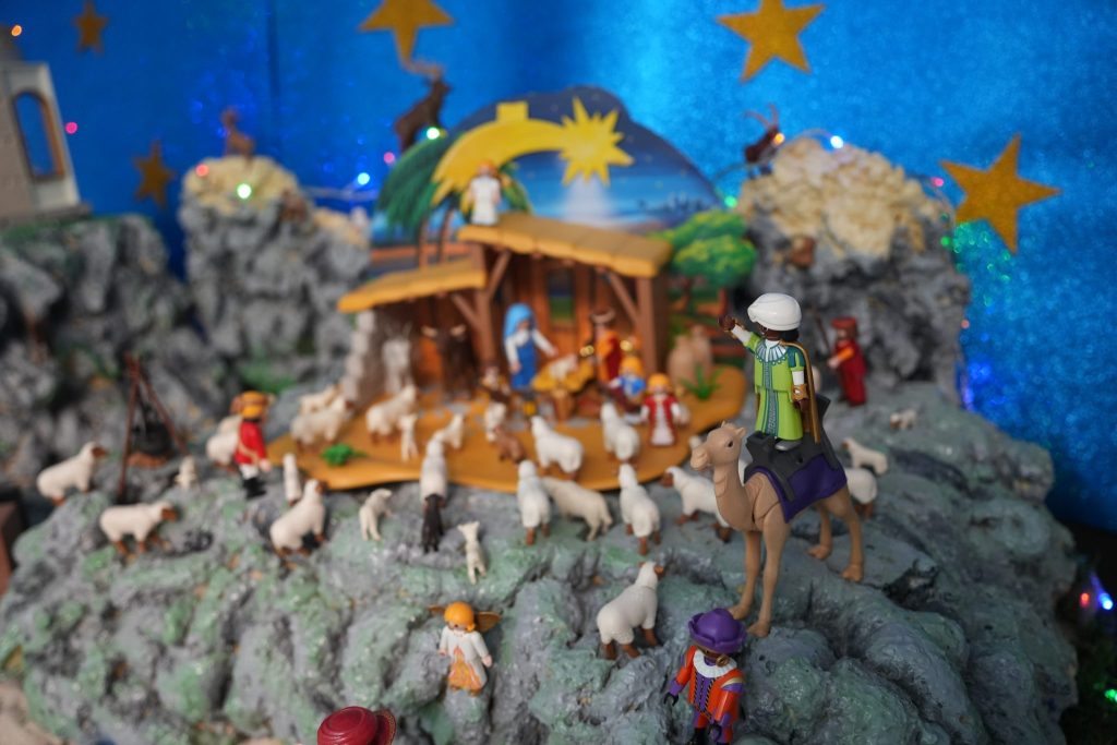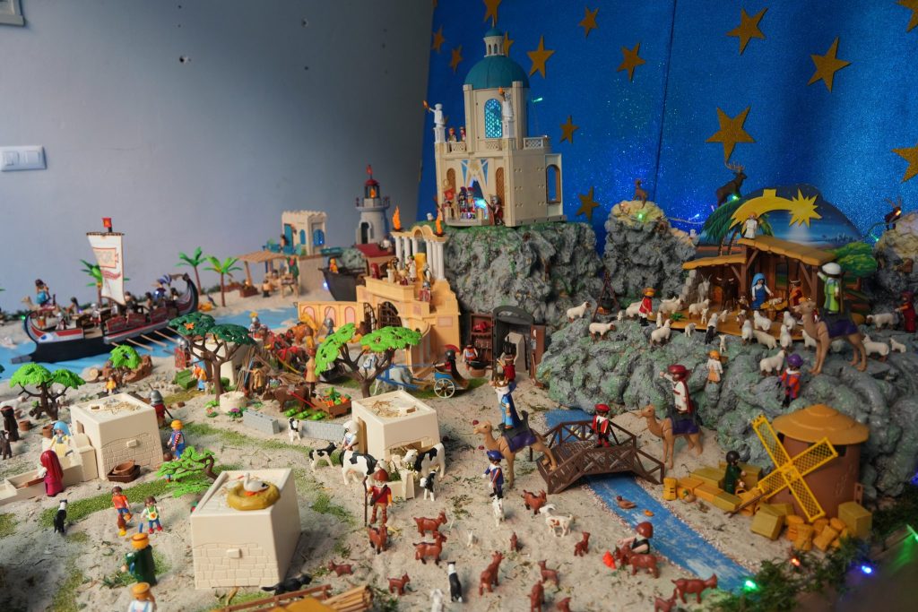 Como explica Daniel, un apasionado de los playmobil, todo empezó con el regalo de un belén de estos muñecos al que le empezó a sumar elementos y a componer diferentes escenas, desde la huida a Egipto, el castillo, llegada de los Reyes Magos, así como imágenes de la vida cotidiana de época, mercado con puestos de frutas, pescados, telares, etc. Todo ello con piezas de coleccionista que Daniel ha ido recopilando a lo largo de los once años que lleva montando el belén.