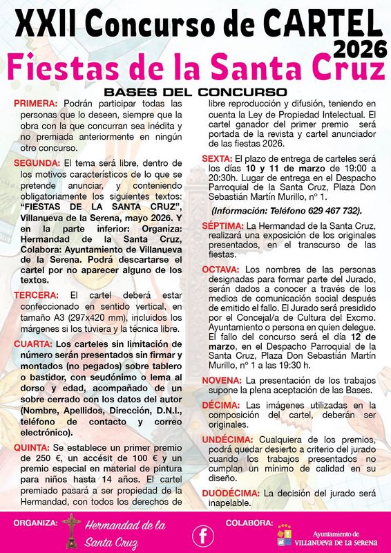 Al igual que en años anteriores, destaca Luis Ramos, presidente de la Hermandad de la Santa Cruz, podrán participar todas aquellas personas que lo deseen mientras que la obra sea única e inédita y no haya sido premiada anteriormente en ningún otro concurso. El tema será libre, siempre y cuando esté enmarcada dentro de los motivos característicos de las fiestas e incluyan los textos “FIESTAS DE LA SANTA CRUZ”, Villanueva de la Serena, mayo 2026 y en la parte inferior: “Organiza: Hermandad de la Santa Cruz, Colabora: Ayuntamiento de Villanueva de la Serena”. El cartel deberá está confeccionado en sentido vertical, en tamaño A3, incluidos los márgenes si los tuviera, y de técnica libre. Además, deberán estar presentados sin firmar y montados sobre tablero o bastidor, con seudónimo o lema al dorso y la edad, acompañado de un sobre cerrado con datos personales del autor.